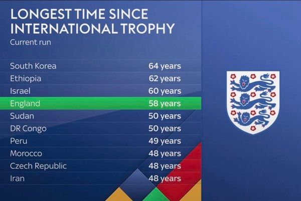 잉글랜드도 축구 종가라는 이름값에 걸맞지 않은 무관 역사를 이어갔다. 잉글랜드는 자국에서 열린 1966 월드컵에서 우승한 이래 단 한 번도 우승컵을 들어올린 적이 없다. 해당 월드컵에서도 결승전에서 ‘유령골’ 논란이 피어오르는 등 약간의 행운이 따랐다. 잉글랜드는 이 우승 이후 결승 문턱조차 밟지 못하다가 유로 2020에서야 다시 결승 무대에 올랐다. 잉글랜드가 유로 2020과 2024에서 모두 준우승에 머물면서 잉글랜드 무관 기간은 58년으로 늘어났다.