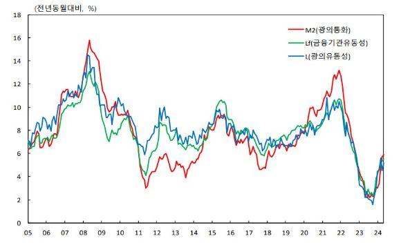 15일 한국은행이 발표한 '2024년 5월 통화 및 유동성'에 따르면 5월 광의통화(M2) 평잔은 4014조1000억원으로 전월 대비 9000억원 증가했다.