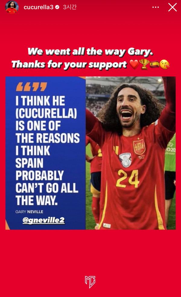 이로써 쿠쿠렐라는 개리 네빌의 비판을 완벽히 뒤엎는 우승을 차지할 수 있었다. 네빌은 유로 2024 기간 영국 ‘ITV’ 전문 패널로 나서 스페인에 대해 “쿠쿠렐라는 스페인이 우승하지 못하는 이유 중 하나”라며 쿠쿠렐라를 계속 기용한다면 스페인이 쓴맛을 볼 수도 있다고 경고했다. 쿠쿠렐라가 모든 경기에서 좋은 경기력을 보여주며 지금 이 발언은 웃음거리가 됐다.