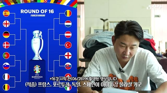 유튜브 PD가 유로 2024 우승국을 예상해 달라는 질문에 이천수는 "내가 리얼로 (분석)하면 무조건 맞히지"라며 "프랑스와 포르투갈, 독일, 스페인이 8강에 올라갈 거고 우승은 스페인"이라고 말했다.