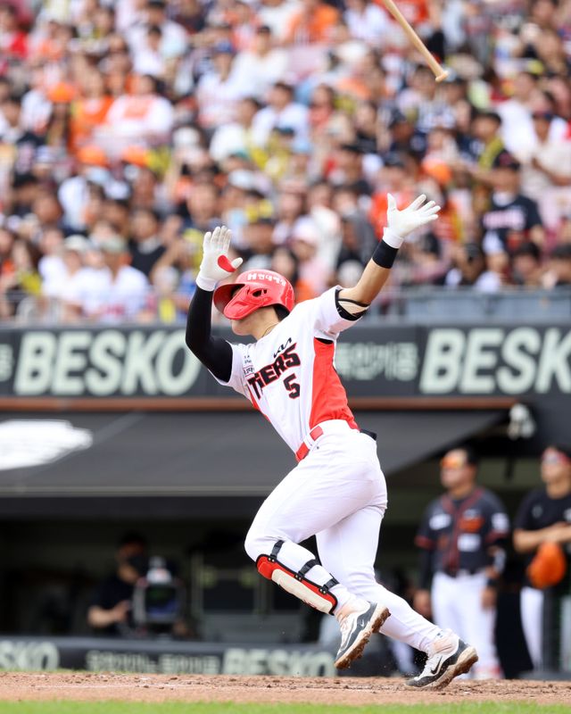 슬림한 체격에서 호쾌한 장타를 뿜어내는 김도영. 배트 플립도 이종범을 떠올리게 한다. 사진은 류현진을 상대로 뽑아내는 장면. KIA 제공