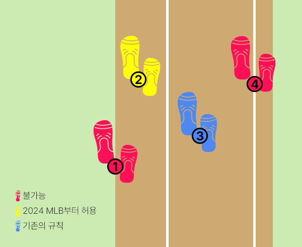 MLB에서는 다른 방식으로 이 문제를 해결하려 했다. 2024년 시즌 시작과 함께 MLB는 전술한 3피트 레인 규칙의 적용 방식에서 세 번째 단계가 아니라 두 번째 단계를 손질했다. 아래 그림처럼 주자가 파울선 좌측 흙을 밟는 것을 허용함으로써 우타자의 주루권을 조금 더 보장한 것이다.