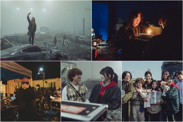 여기에 독보적인 헤어스타일로 촬영장 곳곳을 누빈 주지훈은 촬영 대기하는 동안 셀카를 찍는 등 여유로운 모습을 보여 시선을 사로잡고, 고된 촬영 현장에서도 김희원, 박주현의 생일을 잊지 않고 챙겨주는 제작진의 모습이 공개되어 미소 짓게 만든다. 영화에서 극과 극 자매의 모습을 보여준 박희본과 박주현은 현실에서는 바라보기만 해도 웃음이 나는 ‘찐자매’ 케미를 발산하고, 마지막으로 모든 촬영을 끝내고 분장도 지우지 않은 채 해맑게 웃는 배우들과 김태곤 감독의 단체 사진을 통해 끈끈한 팀워크를 짐작하게 한다.