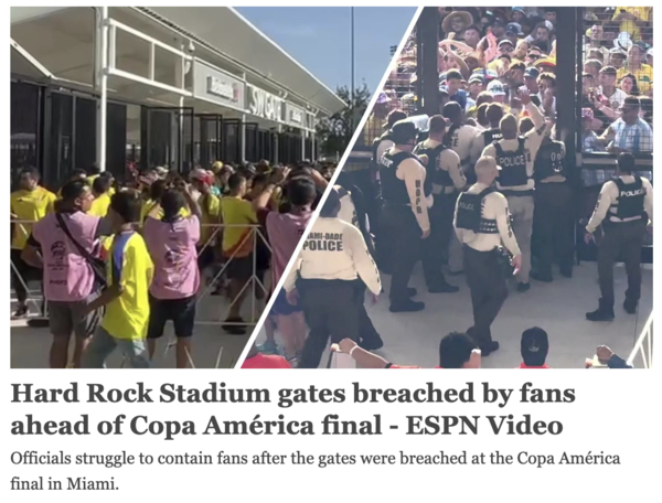 지난 15일 오전 9시 미국 마이애미의 하드록 스타디움에서 시작될 예정이었던 코파 아메리카 결승전은 관중 소요로 인해 1시간 정도 지연됐다. 입장권을 소지하지 않은 사람들이 경기장 곳곳에서 경기장 내부로 진입을 시도하다가 현장에 있던 경찰 및 보안요원과 충돌했다. 경찰은 출입구를 폐쇄해 최대한 입장권이 없는 관중의 입장을 제재하려 시도했으나 일부 출입문 근처 난간이 부서져 무자격 관중이 그대로 잠입하는 경우도 있었다. 경기 도중에서 관중석에서 불시로 입장권 검사를 진행해 입장권이 없는 사람들을 내보내는 일도 벌어졌다.