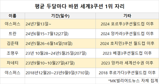 하지만 자네티도 두 달도 안돼 내려왔다. 2023년 10월 베겔3쿠션월드컵이 끝나면서 조명우(서울시청, 실크로드시엔티)에게 바톤을 넘겨줬다. 재임기간은 47일(2023년 9월10~10월27일)이었다. 조명우는 베겔대회가 종료된 2023년 10월28일 처음으로 세계1위에 올랐다. 한국 선수로는 2015년 최성원 이후 두 번째다. 하지만 조명우도 오래 가지 못했다. 2024년 5월 베트남 호치민3쿠션월드컵이 끝나자 207일(2023년10월28~2024년5월25일) 동안 지켜온 1위 자리에서 내려왔다.