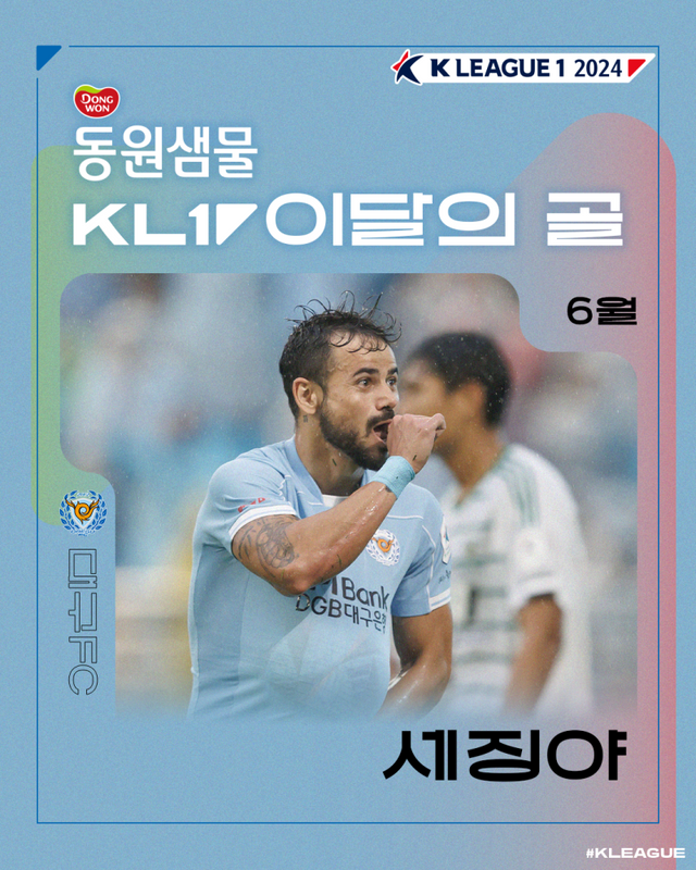 프로축구 K리그1 대구FC 세징야가 2024시즌 6월 K리그 ‘마시는 천연 미네랄 동원샘물 이달의 골'을 수상했다.