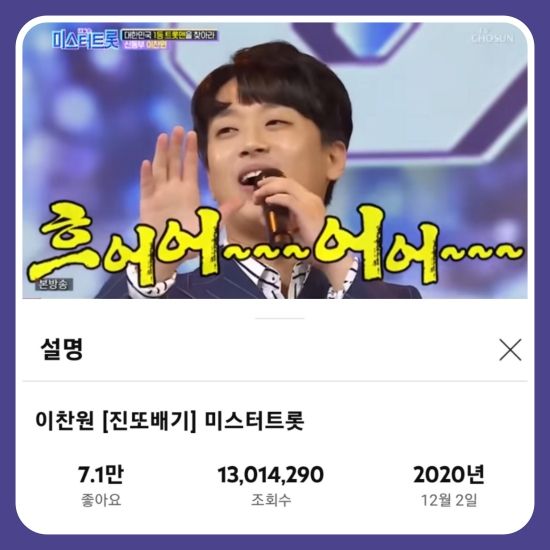 최근 이찬원의 '진또배기' 무대 영상이 그의 공식 유튜브 채널인 '이찬원'(일명 또튜브)에서 1,300만 뷰를 돌파했다.