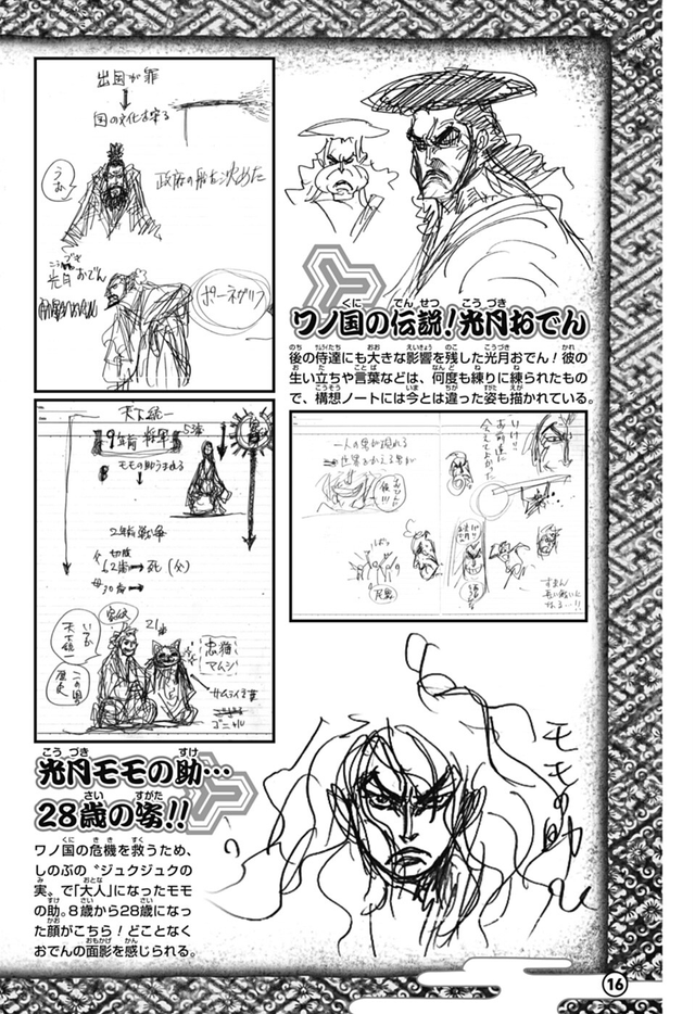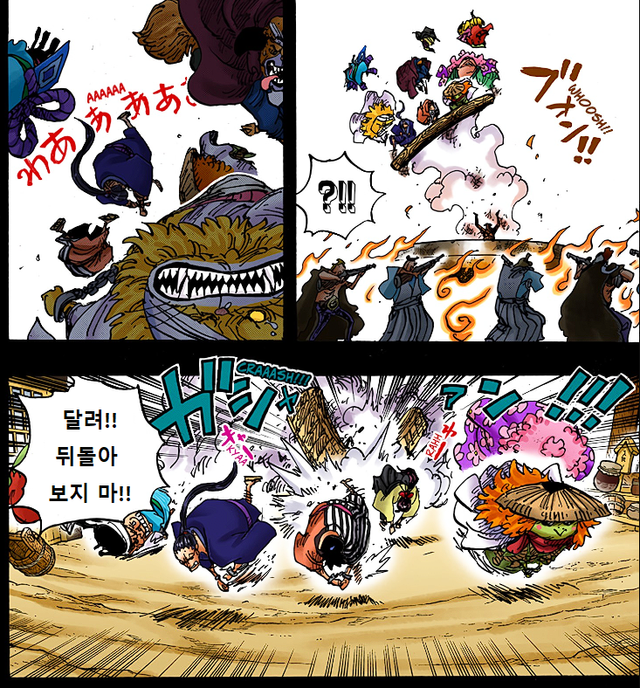 이 경험은 그의 인생에 있어 최대의 트라우마로 남게 됩니다. 와노쿠니를 개국하라는 유언을 남긴 뒤, 짊고 있던 널빤지를 집어던져 9명의 가신들을 전부 도주시킵니다. 자신 또는 타인을 미래로 보낼 수 있습니다. (과거는 불가능) 20년 후의 미래로 보냈는데 후에 킨에몬 일행이'몽키 D. 루피'와 만나 손잡게 되는 것이 2부의 시작이죠.. 신분을 감추고 살아가게 됩니다. 토키는 원래 800년 전에 태어난 인물인데 능력을 이용해 미래로 계속 건너뛰어온 결과 현재에까지 도달했고, 오뎅을 만난 게 여행의 종착지라며 더 이상 미래로 가는 것을 거부해 백수 해적단 손에 죽음을 맞습니다. 와노쿠니에 진짜 지옥이 찾아오게 되죠. 성인 남성들은 무기공장에 끌려가 노예로 일하게 됐고, 공장 때문에 강이 오염 돼 식량난에 시달리는 등 나라 자체가 카이도의 도구로 전락합니다. 게다가 쇄국정책을 펼치고 있어 세계정부 연합에 가입하지 않아 해군이 출격하는 일도 없었습니다. 유일한 구원은 죽음 뿐. 엄마가 누군지는 안 나왔습니다. 오뎅의 처형식과 그의 생애가 담긴 일지를 보고 감명 받아 자신도 오뎅처럼 되고 싶다며 그를 자칭하기 시작합니다. 굉장히 어린 나이임에도'패왕색 패기'를 발현한 딸에게 흥미를 보인 카이도지만.. 아무리 딸이어도 오뎅을 자칭하는 것에 대해 자비란 없었습니다. 카이도에게 있어서 오뎅은 숙적이었고, 트라우마까지 심어준 인물... 자기 말에 복종할 때까지 학대를 일삼았으나 야마토의 마음은 꺾이지 않았고.. 카이도는 천룡인을 끌어내려 힘 있는 자들만이 살아남을 수 있는 '약육강식'의 세계를 만들려고 합니다. 대전쟁을 일으키기 위해 무기를 만들고 세력을 불리는데 열중했죠. 그 결과, 백수 해적단은 그 흰 수염 해적단조차 쉽사리 건들지 못할 정도로 성장. 백수 해적단의 간부진을 전부 동물계 열매를 기반으로 한 무투파로 구성한 카이도는 세계 최강의 생물이라 불릴 정도의 강함을 지니게 되며, 대해적 에드워드 뉴게이트와 어깨를 나란히 하는 대해적, 사황의 자리에 오릅니다. 'SMILE'이라는 동물계 인조 악마의 열매를 만들어내기 시작합니다. 이에 카이도는 와노쿠니에서 생산되는 해루석과 무기를, 도플라밍고는 스마일을 주며 서로 윈윈이 되는 거래를 했습니다. 먹고 힘을 얻을 확률은 10%에 불과하며, 꽝을 뽑게 되면 분노, 슬픔 등의 감정 표현을 웃음 소리로만 낼 수 있게 되죠. 게다가 힘을 얻더라도 동물의 형태를 자유자재로 변형시키지 못할 수도 있습니다. 그래도 성공작을 먹으면 안 먹은 애보다는 센 게 확실하니 카이도는 대량의 스마일을 해적단 멤버들에게 먹였습니다. 이러한 시기에 흰 수염 해적단 vs 해군 세력이 전쟁을 벌이는 정상전쟁이 일어나는데요. 1부 당시 언급됐던 행적과 2부에서 보여준 모습의 차이가 꽤나 괴리감이 들기도 하는데 코즈키 오뎅의 초기 설정안을 한 번 봐볼까요 2부에서의 흰 수염 - 오뎅 - 카이도 이들 관계를 생각하면 정황상 와노쿠니는 흰 수염의 영토였으나 그가 사망하면서 보호 세력이 없어진 틈을 타 카이도가 와노쿠니를 침공해 오뎅을 죽이고 나라까지 꿀꺽했다.. 라는 것이 초기 설정이라 추측되는데요. 아무래도 오다 작가님의 건강 상태가 굉장히 안 좋은 것과 더불어 로저 해적단, 코즈키 오뎅 이야기를 나누면 전개가 굉장히 느려질 것이라 생각한 것인지 이 두 이야기를 합치면서 꽤나 설정 충돌이 일어난 듯싶죠. 그래서 와노쿠니 편을 읽다보면 뭔가 스토리가 좀 작위적인데? 라는 부분이 많이 느껴지기도 합니다. 그 사황 공백은 티치가 차지하는 데 성공합니다. 정상전쟁이 끝나고 2년 뒤... 카이도 세력에게 도전장을 내미는 것이 2년 후 스토리의 시작을 알리게 되죠. 그냥 카이도가 사황 자리에까지 어떻게 오르게 되었는가에 대한 과정을 한 번 소개해 볼까 싶어 작성해 봤습니다..