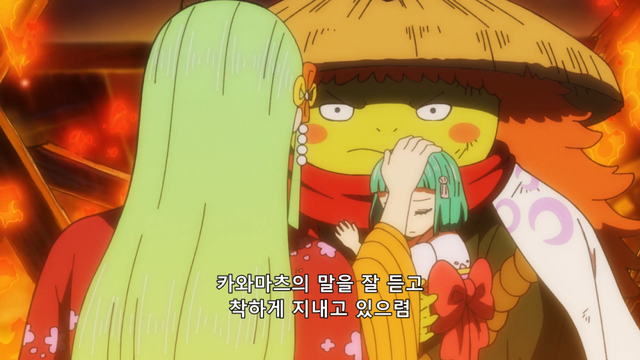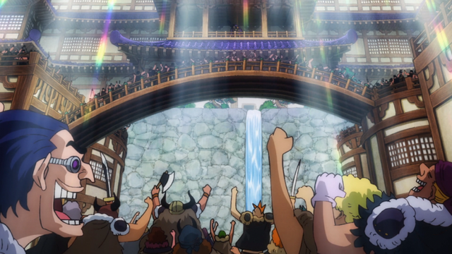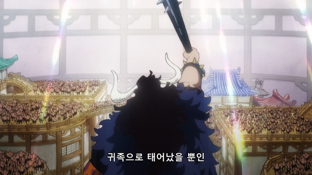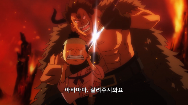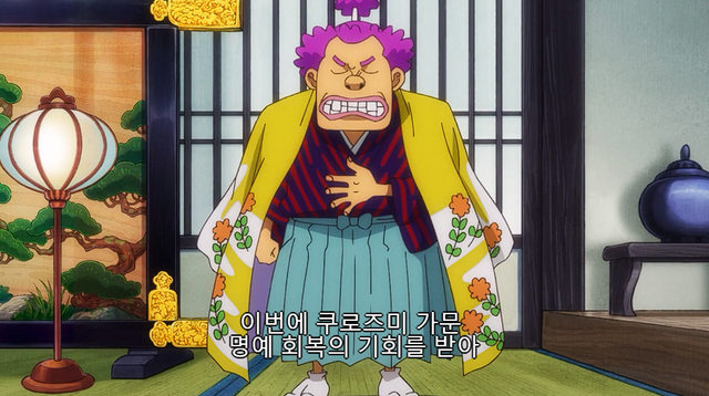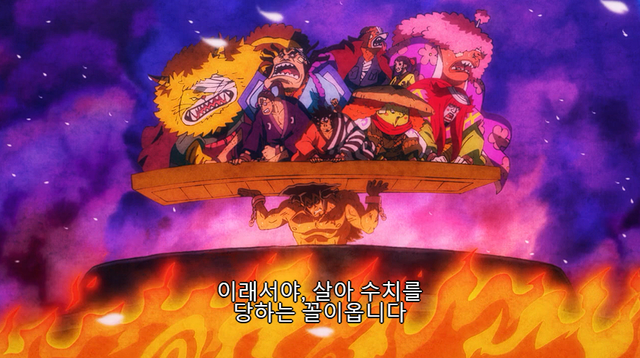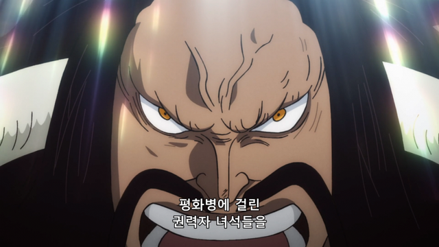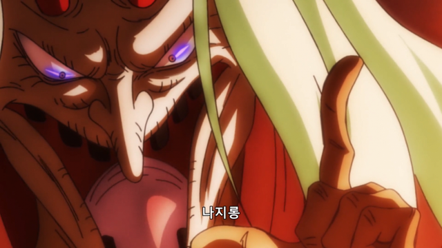 멤버들을 한 명 한 명 모으며 선장 생활을 하던 도중.. 와노쿠니 출신의'쿠로즈미 히구라시'라는 노파가 찾아오는데요. 무지막지한 강함을 지닌 카이도가 세계의 정점에 서야 된다고 이야기합니다. 보드카 왕국의 병사 생활부터 시작해서 록스 해적단 시절까지.. 약자는 절대 살아남을 수 없었던 인생을 살아온 카이도는 이에 수긍.. 노파는 정점에 서기 위한 단계의 초석인 와노쿠니 점령.. 그것을 위한 계획 하나를 제안합니다. 와노쿠니의 경우, 악마의 열매 능력자들을 무력화 시키는 해루석의 원산지이기도 하며 '원피스'가 있는 '라프텔'의 위치를 가리키는 4개의 로드 포네그리프 중 하나가 있습니다. 게다가 지형이 특이해 쉽게 드나들 수 없는 철벽의 요새로 불려 세력을 확장하기 딱 좋은 환경을 지녔죠. 와노쿠니의 쇼군'코즈키 스키야키'를 납치해 외진 곳에 가둬놨고, 타인의 얼굴과 체형, 목소리를 재연해낼 수 있는'복사복사 열매'의 힘을 가진 히구라시가 병에 걸린 쇼군의 모습을 연기했죠. 당시 쇼군의 정통 후계자였던 '코즈키 오뎅'이 세계 여행을 떠나 와노쿠니에 없었기에 이걸 명분으로 '쿠로즈미 오로치'를 쇼군 대리인으로 세웁니다. 이에 의문을 갖는 다이묘가 있긴 했지만, 쇼군의 명령이니 따를 수 밖에 없는 상황.. 오로치에 대해 잠깐 설명하자면 그의 할아버지가 주위 다이묘들을 독살하며 쇼군의 자리를 탐하다가 발각돼 할복당했고, 그대로 쿠로즈미 가문은 풍비박산.. 그것까진 선대의 죄가 있으니 납득할 수 있었지만 그 자손들까지 쿠로즈미 라는 이유만으로 얻어맞고 죽는 등 죄인 취급당하는 연좌제에 시달리는 바람에 와노쿠니를 멸망시켜 복수 하기로 마음먹은 상태입니다. 쇼군 대리인에 선 오로치는 모아둔 돈을 이용해 자기를 지켜줄 든든한 해적 '카이도'를 와노쿠니로 불러들이는데요. 그는 자신의 능력으로 카이도를 포섭한 거라 생각했지만 모든 게 카이도와 히구라시가 뒤에서 짜고 친 작전이었죠. 이후.. 로저 해적단과 함께 라프텔에 가서 '원피스'의 정체가 무엇인지까지 알아낸 코즈키 오뎅이 와노쿠니에 귀환합니다. 하지만 현재 와노쿠니는 오로치의 폭거로 인해 대다수의 국민들이 참담한 생활을 하고 있었고.. 이를 보다 못한 오뎅이 가신들과 함께 오로치를 보호하고 있는 카이도와 전투를 벌이러 향합니다. 그 순간 오뎅의 눈에 들어온 건 인질로 잡힌 아들 '코즈키 모모노스케' 싸움은 카이도의 승리로 마무리되고 말죠.