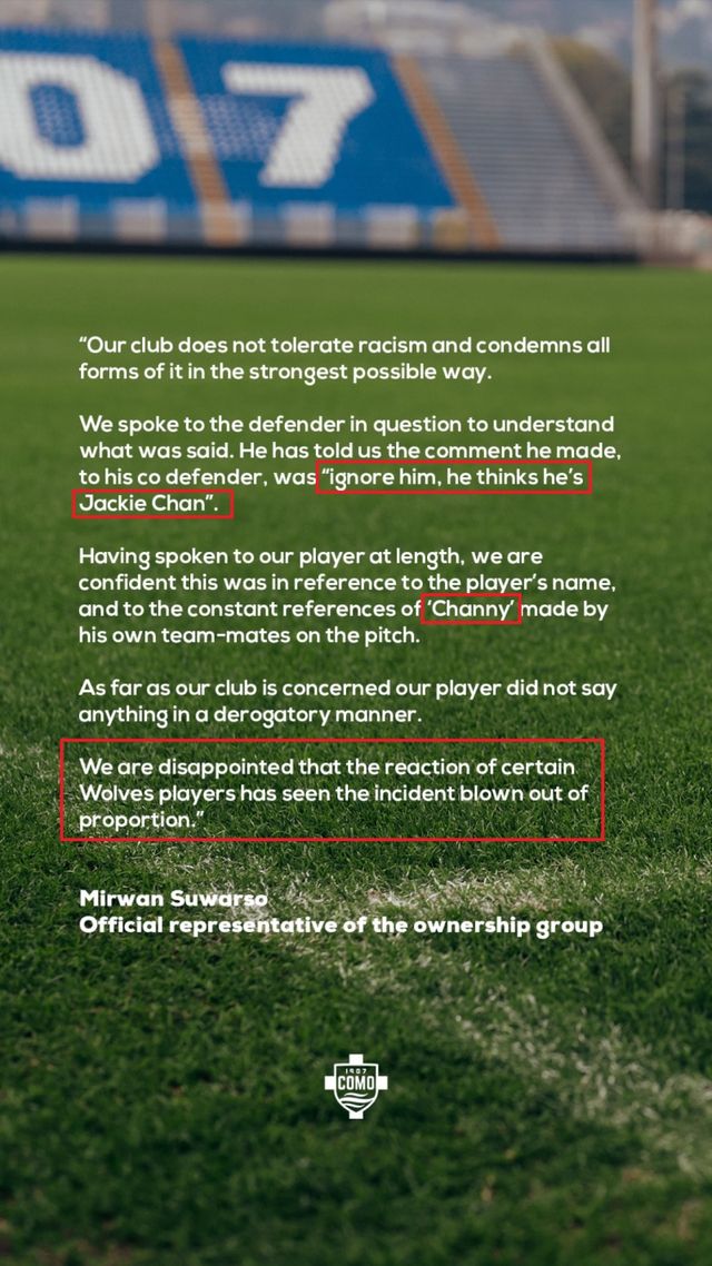 그럼에도 코모는 ‘재키 찬’이라는 표현을 사용했다고 소속팀 선수를 감싸고, 오히려 울브스를 비난하는 입장문을 게시한 것이다. 특정 인종, 캐릭터를 언급하는 행위 자체가 인종차별성 의도가 담긴 것을 망각한 모양새다.