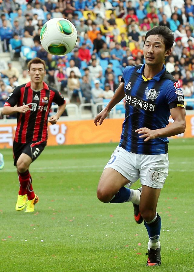 2013년 10월 6일 인천축구전용경기장에서 열린 프로축구 K리그1 인천 유나이티드 대 FC서울의 경기에서 공중에 뜬 공을 인천 이천수가 차지하려 하고 있다. / 연합뉴스