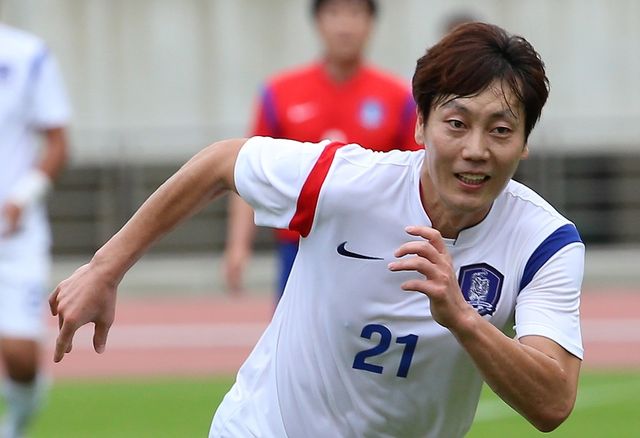 2014년 8월 8일 오후 경기 화성종합경기타운에서 '2014 I-리그 여름축구축제·아시아유소년축구축제'의 성공을 위해 마련된 연예인 올스타팀과 국가대표 출신 선수들의 친선경기에서 송종국 선수가 돌파를 시도하고 있다. / 연합뉴스