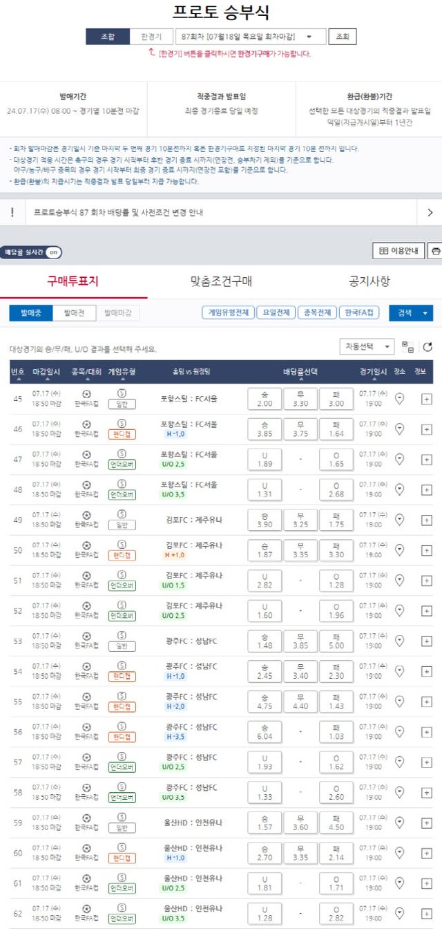 오는 7월 17일 오전 8시부터 발매를 전개한 프로토 승부식 87회차에서 코리아컵 8강전을 대상으로 하는 경기는 △포항스틸러스-FC서울(45~48번) △김포FC-제주유나이티드(49~52번) △광주FC-성남FC(54~58번) △울산현대-인천유나이티드(59~62번)전 등이다.