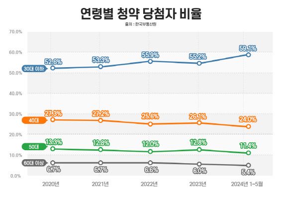 17일 부동산시장 분석업체 부동산인포가 한국부동산원 ‘연령별 청약 당첨자 정보’를 분석한 결과 올해 1~5월 수도권 청약 당첨자 1만 5790명 중 30대 이하는 9339명(59.1%)에 달하는 것으로 나타났다. 전년동기(57.1%) 대비 2.0%포인트 늘어난 수치로 10명 중 6명 가량이 30대 이하인 셈이다.