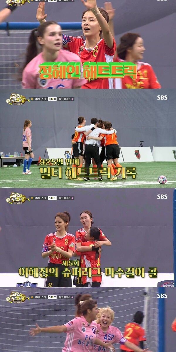 하지만 강력한 공수의 맞대결로 쉽게 골이 터지지 않았고, 전반전 종료 직전에 가서야 ‘액셔니스타’ 정혜인의 선제골이 터졌다. ‘액셔니스타’는 선제골의 기세를 몰아 후반전에도 분위기를 가져오며 골 잔치를 벌였다. 정혜인은 공격형 골키퍼인 케시의 빈 자리를 정확하게 찾아내 시원한 중거리 골을 두 번 연속 터뜨리며 925일 만에 멀티 해트트릭을 기록했다. 이 장면은 분당 최고 시청률 6.9%를 기록하며 ‘최고의 1분’을 차지했다.