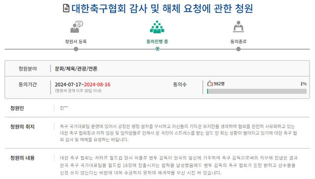 또 청원 내용은 지난 2022 카타르 월드컵에서 16강의 성과를 낸 파울루 벤투 감독과 재계약하지 않고 위르겐 클린스만 감독을 선임한 내용으로 시작한다.