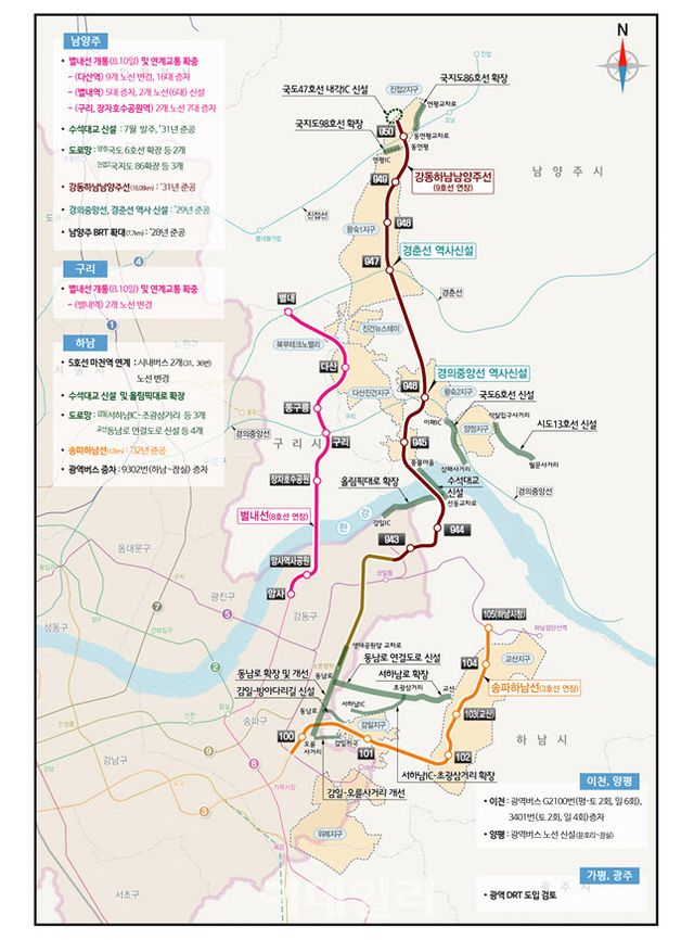 서울 3호선 연장선인 송파하남선(2032년 준공), 서울 9호선 연장선인 강동하남남양주선(2031년 준공), 남양주 왕숙 지구 내 경의중앙선·경춘선 역사 신설(2029년 준공) 등 철도사업은 기관 간 갈등 중재를 통해 신속하게 추진한다.