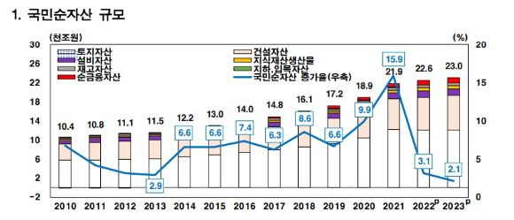 [아이뉴스24 박은경 기자] 지난해 주가 반등으로 국민순자산이 증가세를 유지했다. 다만 주택 가격 하락으로 증가 폭이 둔화하며 명목 국내총생산(GDP) 대비 9.6배 수준으로 낮아졌다.