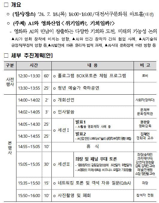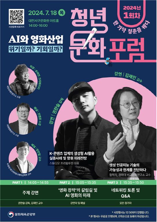 [이데일리 김미경 기자] 문화체육관광부는 18일 오후 2시 대전서구문화원 아트홀에서 ‘인공지능(AI)과 영화산업, 위기일까, 기회일까?’를 주제로 2024년 제1차 청년문화포럼을 개최한다고 밝혔다.