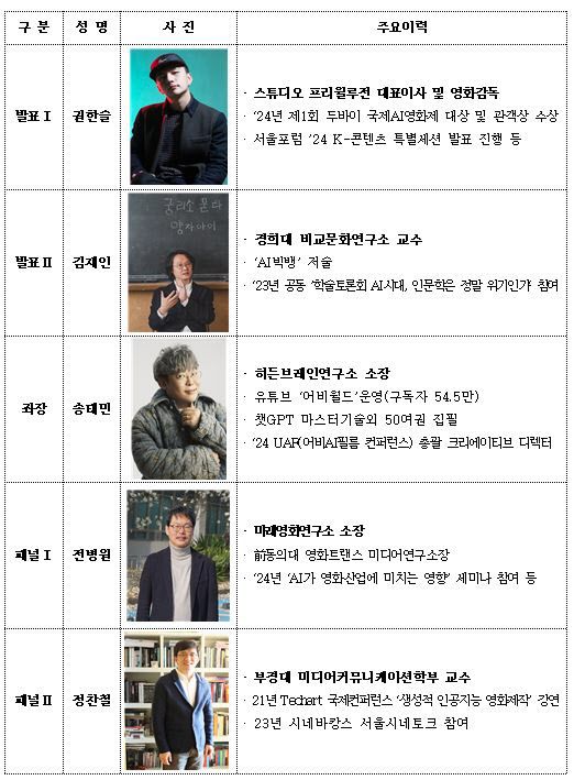 이날 제1차 포럼에서는 ‘제1회 두바이 국제인공지능(AI)영화제’ 대상과 관객상을 받은 권한슬 감독과 ‘인공지능(AI)빅뱅: 생성 인공지능과 인문학 르네상스’ 저자인 경희대 비교문화연구소 김재인 교수가 강연자로 나선다. 권한슬 감독은 AI를 활용한 영화제작 사례 등 K(케이)-콘텐츠업계의 생성형AI 활용 실증 사례와 미래 전망을, 김재인 교수는 AI산업의 전반적인 상황과 생성형AI 기술의 긍정과 부정적 영향을 주제로 강연한다.