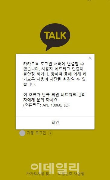 카카오(035720) 관계자는 “현재 PC버전 카카오톡 등 일부 이용자에게 카카오 계정 로그인이 원활하지 않은 현상이 발생하고 있어 긴급 점검 중”이라고 밝혔다.