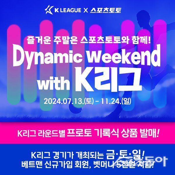 먼저 공식 인터넷 발매 사이트 베트맨의 ‘Dynamic Weekend with K리그’ 이벤트에선 K리그 경기 기간인 7월 13일부터 11월 24일까지 주말(금~일요일)에 가입한 신규 회원 전원에게 벳머니 5000원을 지급한다.