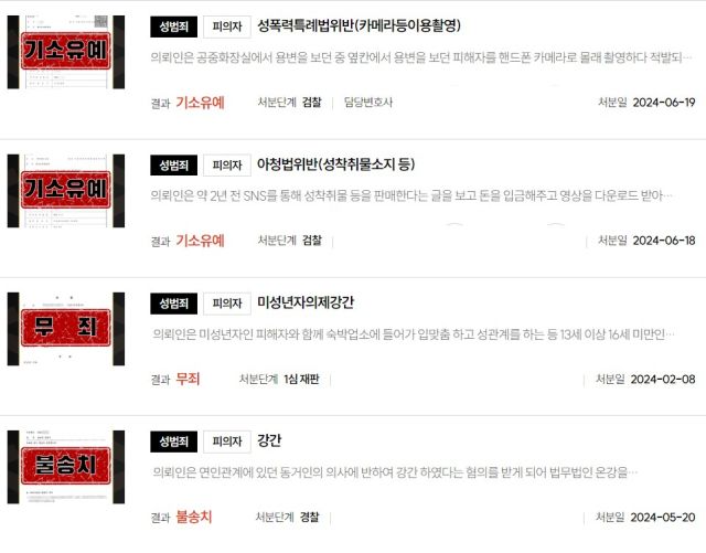 이 법무법인은 성범죄 사건을 특화 분야로 내세운다. 홈페이지 내 성공 사례‧'꿀팁'난을 보면 성범죄 관련 내용이 대다수이며, 그 중에서도 피해자가 아닌 피의자 변호 사례가 절대 다수를 이룬다. 최근 성공 사례로 소개된 100건 중 피해자 변호 사례는 단 6건에 불과했고, 나머지 94건이 피의자를 변호한 내용이다.