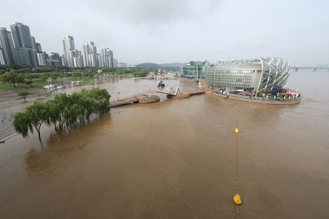 폭우로 한강 수위가 상승한 19일 오전 서울 서초구 반포한강공원 일대가 물에 잠겨 있다. / 뉴스1
