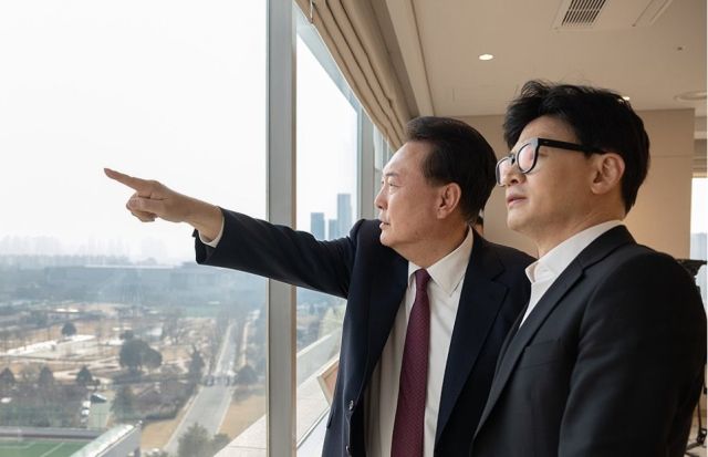 ▲윤석열 대통령이 서울 용산 대통령실 청사에서 가진 국민의힘 지도부와의 오찬에서 창밖을 보며 한동훈 비상대책위원장과 대화하고 있다. 2024.1.29 ⓒ연합뉴스