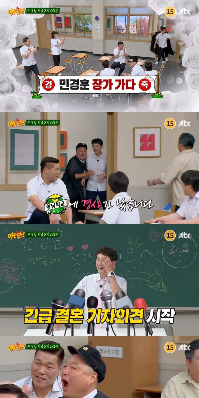 지난 20일 방송된 JTBC ‘아는 형님’ 방송 말미에 나온 예고편에서 민경훈이 결혼 축하를 받는 모습이 공개됐다. 강호동은 민경훈의 손을 잡고 등장하며 “신랑 입장”을 외쳤고 이상민은 “가는구나”라고 소리쳤다.