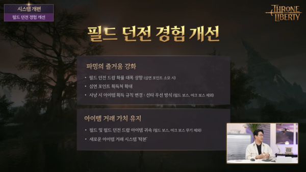 특히, 필드 사냥의 경우 파밍의 즐거움 강화와 아이템 거래 가치 유지를 위해 대대적인 개편에 나선다는 설명이다. 심연 포인트 소모를 통해 필드 던전 아이템 드롭 확률을 대폭 높일 수 있으며, 필드 보스와 아크 보스를 제외한 몬스터 제거 아이템 획득 규칙은 ‘선타’ 우선 방식으로 변경된다. 아울러 필드 및 필드 던전 드롭 아이템은 귀속 상태로 얻게 되며, 아이템을 탁본지로 변경하는 ‘탁본’ 시스템이 추가된다.