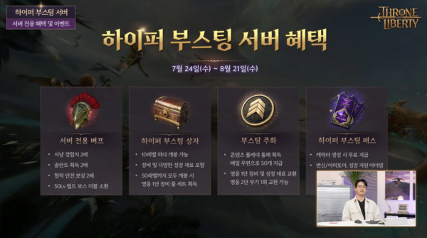 먼저, 7월 24일부터 8월 21일까지 운영되는 ‘하이퍼 부스팅 서버’는 신규 및 복귀 이용자들의 빠른 성장 지원을 위해 마련됐다. 경험치·솔란트·협력 던전 보상 2배 등 서버 전용 버프가 제공되며, 캐릭터 생성 시 지급되는 서버 전용 패스를 통해 각종 성장 재료를 함께 얻을 수 있다. 이외에도 각종 장비를 얻을 수 있는 하이퍼 부스팅 상자, 주화, 이벤트 등 각종 혜택이 이용자들의 빠른 성장을 도울 예정이다.