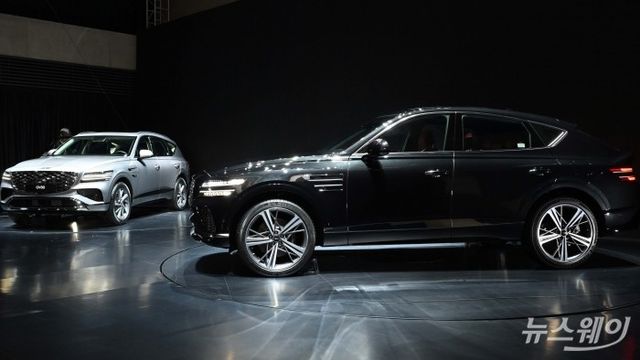 제네시스 'GV80 & GV80 쿠페' 미디어 프리뷰가 26일 오전 경기 용인시 제네시스 수지전시관에서 열린 가운데 (왼쪽)페이스리프트 'GV80'과 'GV80 쿠페' 신차량이 공개되고 있다. 사진=강민석 기자 kms@newsway.co.kr