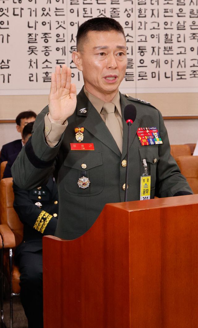 임성근 전 해병대 1사단장이 19일 오후 서울 여의도 국회 법제사법위원회에서 열린 ‘윤석열 대통령 탄핵소추안 즉각 발의 요청에 관한 청원 관련 1차 청문회’에서 증인 선서를 하고 있다. (사진=뉴스1)