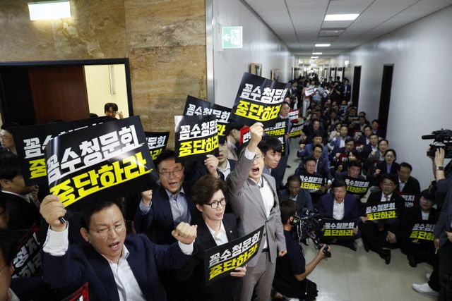 19일 오전 국민의힘이 ‘윤 대통령 탄핵 청원 청문회’ 강행을 규탄하는 모습. (사진=뉴스1)