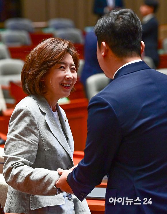 나경원 국민의힘 당대표 후보가 19일 오전 서울 여의도 국회에서 열린 의원총회에서 동료 의원들과 인사를 나누고 있다. [사진=곽영래 기자]