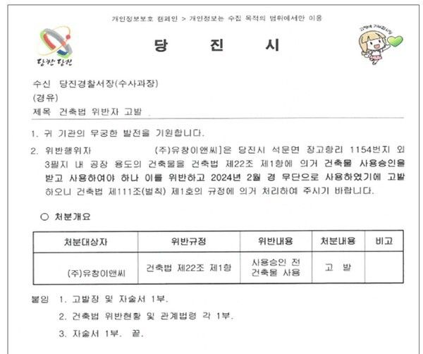 이에 당진시는 2월28일, 사용승인을 받지 않은 대지와 건축물 내부에 공장 운영을 위한 원자재가 반입돼있음을 확인하고, 건축법 제22조에 따라 건축물 사용이 불가하다는 원상회복 통지서를 유창이앤씨에 보냈다.