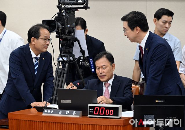 아시아투데이 송의주 기자 = 22일 국회에서 열린 김병환 금융위원장 후보자의 인사청문회에서 윤한홍 위원장(가운데)과 여야 간사인 강민국 국민의힘 의원(오른쪽), 강준현 더불어민주당 의원이 이야기를 나누고 있다.