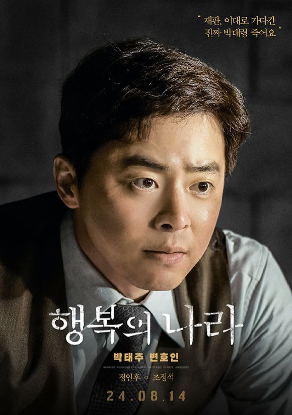 '행복의 나라'는 1979년 10월 26일, 상관의 명령에 의해 대통령 암살 사건에 연루된 박태주(이선균)와 그의 변호를 맡으며 대한민국 최악의 정치 재판에 뛰어 든 변호사 정인후(조정석)의 이야기를 그린 영화다. 故 이선균의 유작이다.