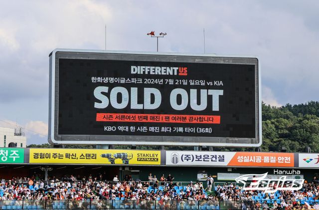 한화는 지난 21일 KIA 타이거즈와 홈경기에서 7-8로 져 7연패에 빠졌다. 이날도 대전 한화생명이글스파크는 1만 2000석은 매진됐다. 올 시즌에만 36번째 만원 관중을 기록하며 1995년 삼성 라이온즈와 같은 단일 시즌 타이기록을 세웠다. 신기록 달성은 시간문제다.