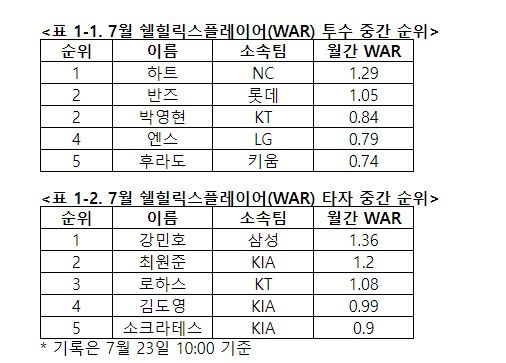 NC 하트의 뒤를 추격하는 선수는 롯데 자이언츠 찰리 반즈(WAR 1.05)와 KT 위즈 박영현(WAR 0.84)이다. 반즈는 7월 10일 SSG 랜더스 등판으로 약 한달 만에 부상에서 복귀했다. 현재 3경기 선발 등판해 2승을 거뒀으며, 모든 경기에서 퀄리티스타트를 기록하는 동시에 매번 9개의 삼진을 뽑아내는 등 빠르게 팀에 힘을 보태고 있다. 한편 KT 박영현은 7월에 등판한 모든 경기를 무실점으로 마무리했다. 7월에만 4개의 세이브를 거뒀으며, 특히 15일 경기에서는 5명의 타자 중 4명의 타자를 삼진으로 돌려세우는 뛰어난 피칭을 자랑하기도 했다.