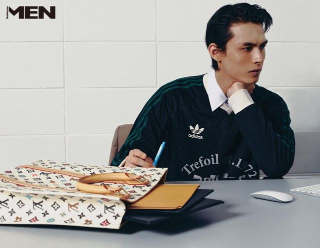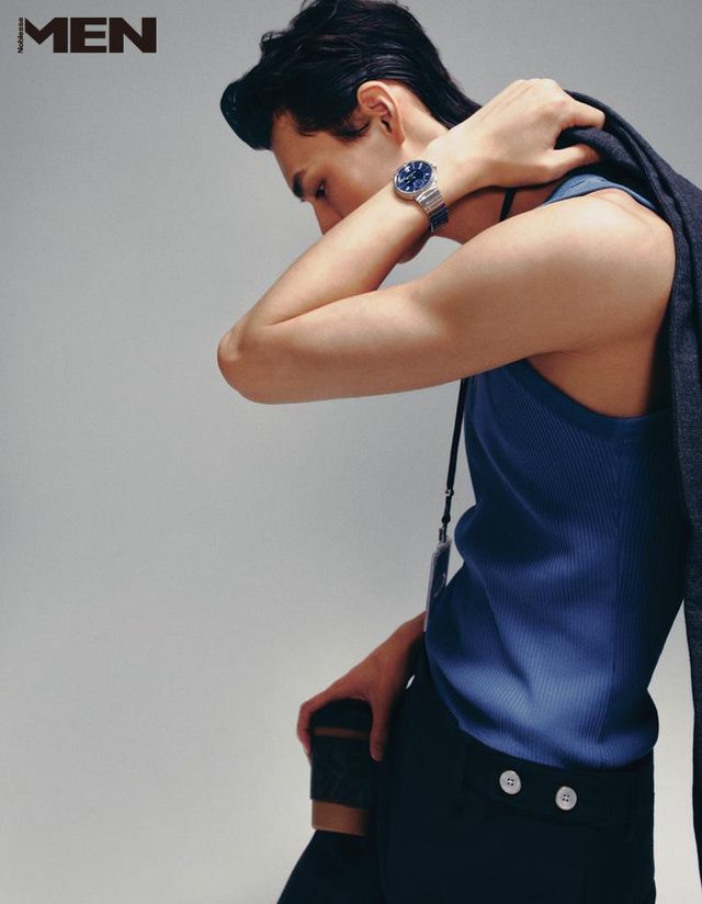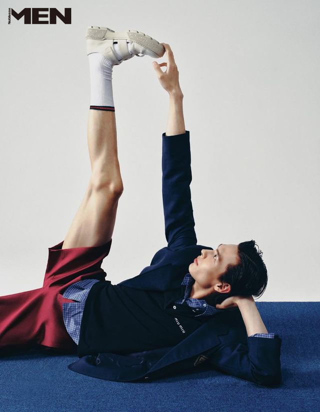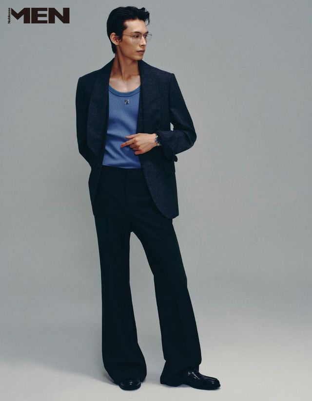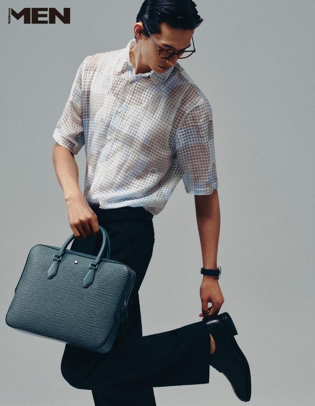 시스루 셔츠와 이너 슬리브리스 톱 모두 Herme `s.네이비 울 팬츠와 레이스업 더비 슈즈 모두 Bally,