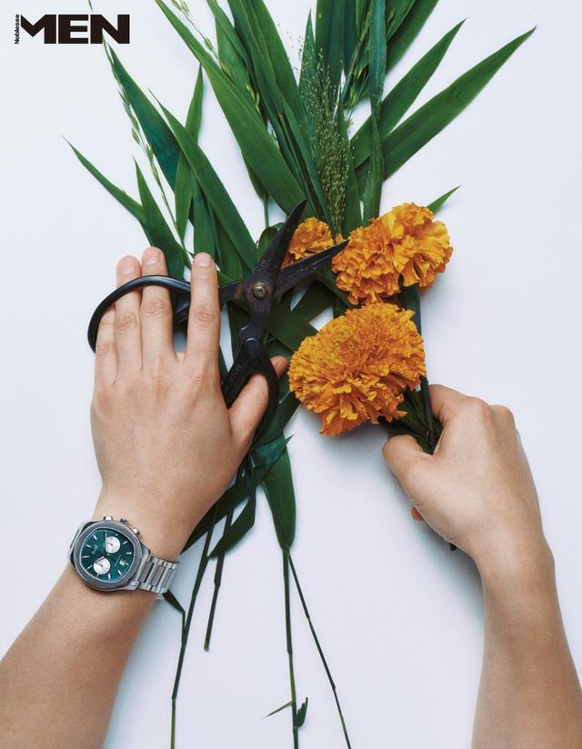 에메랄드그린 다이얼과실버 크로노그래프 카운터를 조합한