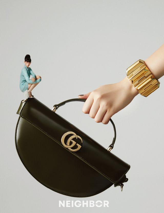 Gucci 시퀸 장식 니트 카디건과 쇼츠, 골드 컬러 메탈 커프, 더블 G 잠금장치가 포인트인 반달 모양 톱핸들 백 모두 가격 미정.