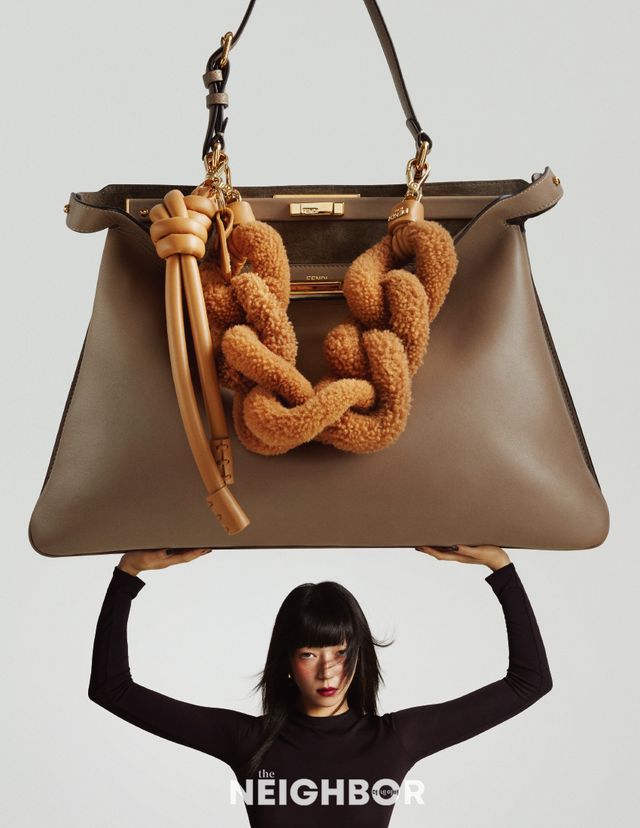 Fendi 자연스러운 실루엣이 연출되는 피카부 아이씨유 소프트 백 라지 800만원대, 매듭 디테일의 오버사이즈 참 가격 미정, 볼드한 체인 모티프의 양털 소재 미니 스트랩 100만원대, 슬림한 실루엣의 비스코스 드레스 400만원대, 메탈과 레더 소재가 어우러진 이어링 90만원대.
