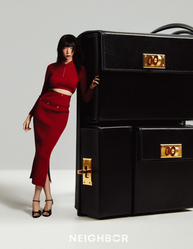 Hermès 박스 형태의 분리된 수납공간과 골드 컬러 메탈 잠금장치가 어우러진 켈리 투 고 파우치, 집업 장식 톱과 웨이스트 밴드 그리고 스커트를 단추로 연결한 니트 드레스, 고트 벨벳 소재에 라인스톤을 장식한 헤덴 샌들 모두 가격 미정.