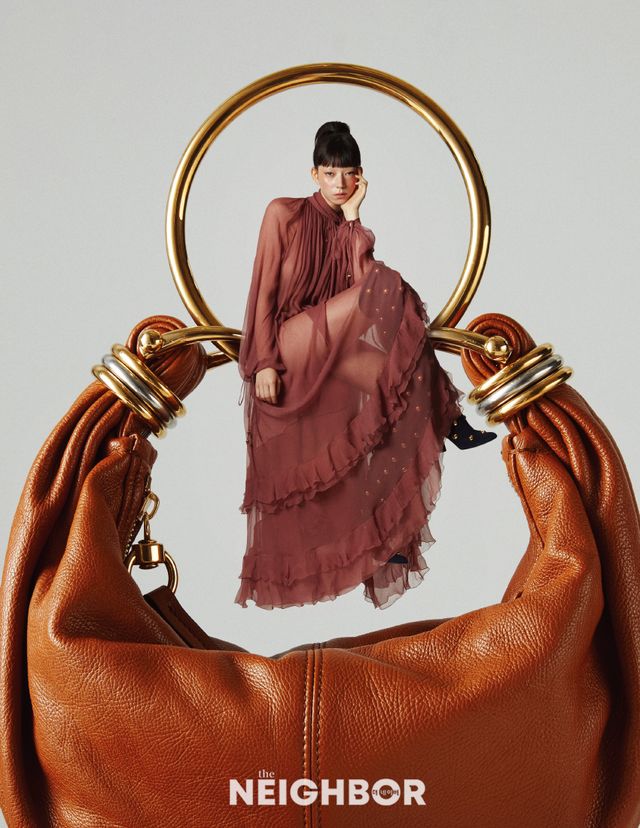 Chloé 광택이 있는 카프스킨 소재의 자연스러운 주름과 메탈 소재 브레이슬릿 핸들이 유연한 라운드 실루엣을 연출하는 호보백 337만원대, 러플과 주름 디테일이 드라마틱한 무드를 연출하는 시스루 맥시 드레스, 쇼츠, 골드 메탈 스터드 장식 스웨이드 부츠 모두 가격 미정.