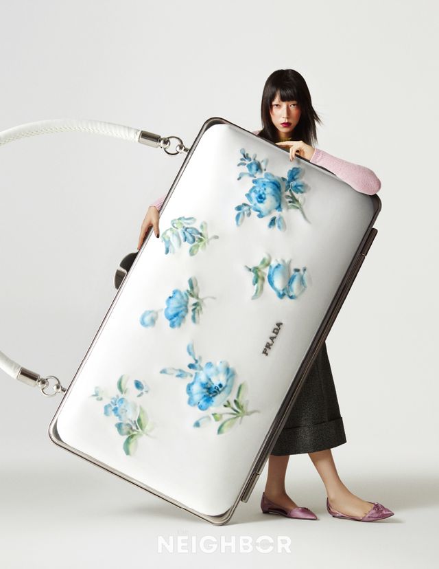 Prada 도자기를 연상시키는 플라워 모티프 클러치백, 핑크 컬러 울 소재 카디건과 올리브그린 니트 톱, 밑단을 롤업한 H라인 울 스커트, 발등에 셔링 디테일을 가미한 새틴 플랫 슈즈 모두 가격 미정.