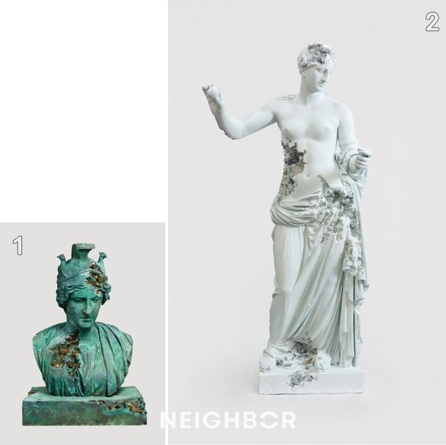 1 ‘Bronze Eroded Bust of Rome Deified’, 2022, Bronze, polished stainless steel, 121.9×81.3×99.1cm. ©Daniel Arsham. Courtesy of the artist and Perrotin. 2 ‘Blue Calcite Eroded Venus of Arles’, 2019, Blue calcite, quartz, hydrostone, 208×102×74cm. Photo by Claire Dorn. Courtesy of the artist and Perrotin.