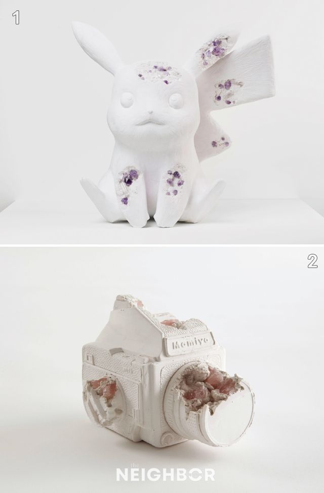 1 ‘Amethyst Crystallized Seated Pikachu’, 2020, Amethyst, quartz, hydrostone. ©Daniel Arsham. Courtesy of the artist and Perrotin. 2 ‘Rose Quartz Eroded Mamiya M645 Camera’, 2022, Rose quartz, quartz, hydrostone, 11.7×12.7×18.1cm. ©Daniel Arsham. Courtesy of the artist and Perrotin.